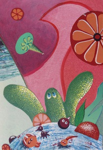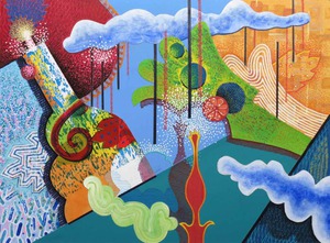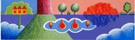Drie bergen zijn te ontdekken in deze collage, gecamoufleerd door figuren en patronen.
